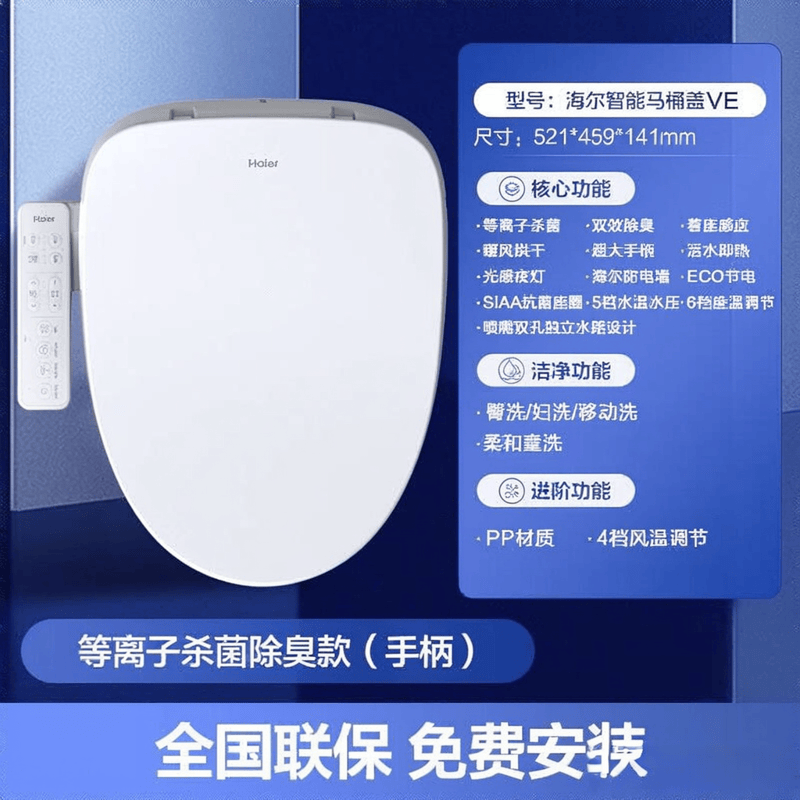 选购建议:如果你追求健康、高品质的生活,VE等离子杀菌款绝对是你不二的选择。它的3D大座圈设计,久坐也不觉得累,而且操作面板简洁易用,老人和小孩都能轻松上手。而且,海尔还为它提供了3年质保,让你买得放心,用得舒心。如果你家马桶周围有电源插座,那么这款盖子简直是完美之选!